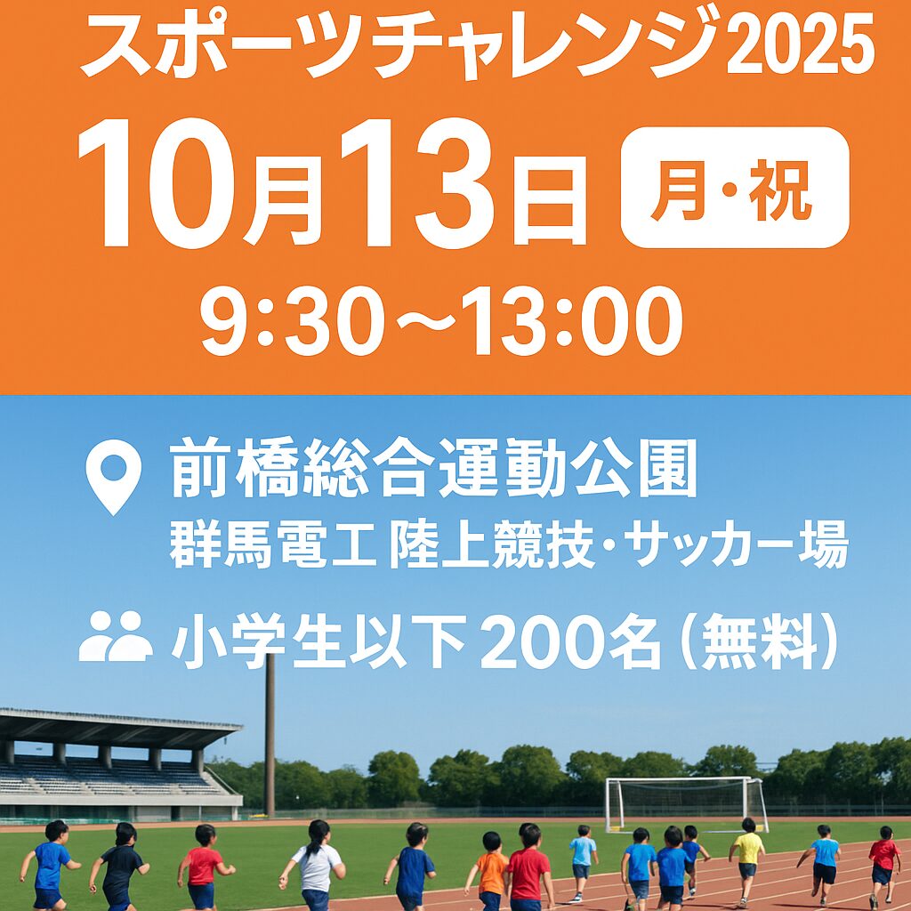 季節はすっかり秋。澄んだ空と心地よい風が運動にぴったりの季節ですね。 「まだ週末・祝日の予定が決まっていない…」という方に朗報です! 小学生以下のお子さま向け『MAESOUスポーツチャレンジ2025』が前橋で開催されます。家族で元気に体を動かす一日を... -