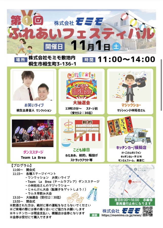 【桐生市】第1回モミモふれあいフェスティバル開催!模擬店・お笑いライブ・大抽選会で楽しもう♪秋の桐生で笑顔あふれる1日を! 秋の風が心地よい季節、桐生市で初開催となる「モミモふれあいフェスティバル」が開催されます! 地域の皆さんや従業員、そのご家族が一…